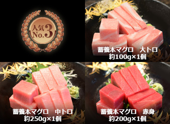 <内容量> ・蓄養本マグロ 大トロサク 約100g×1個 ・蓄養本マグロ 中トロサク 約250g×1個 ・蓄養本マグロ 赤身サク 約200g×1個